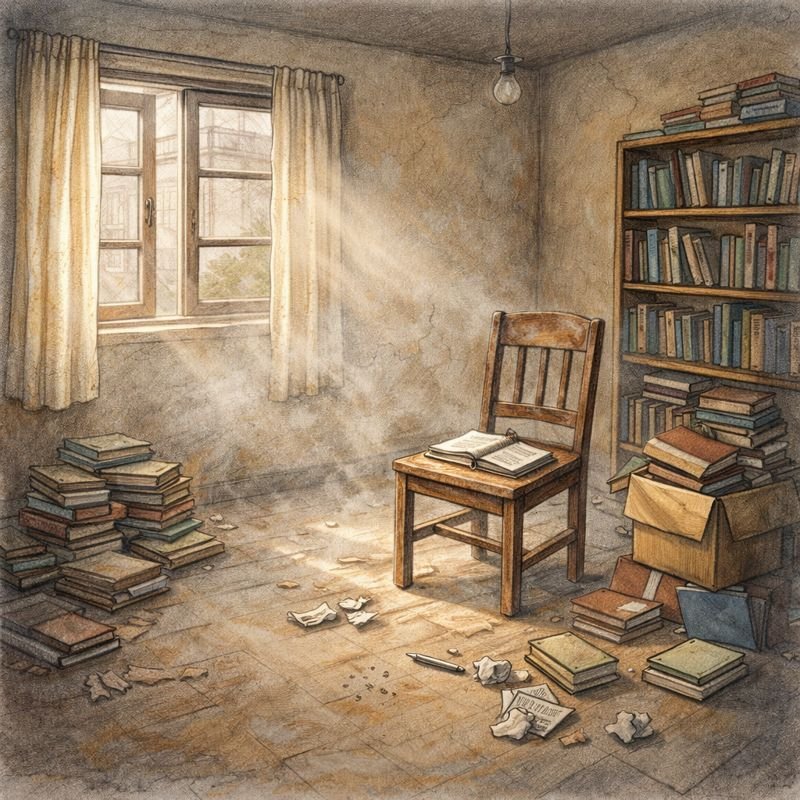 वहाँ पुरानी किताबें थीं, धूल जमी अलमारी थी और एक टूटी कुर्सी।