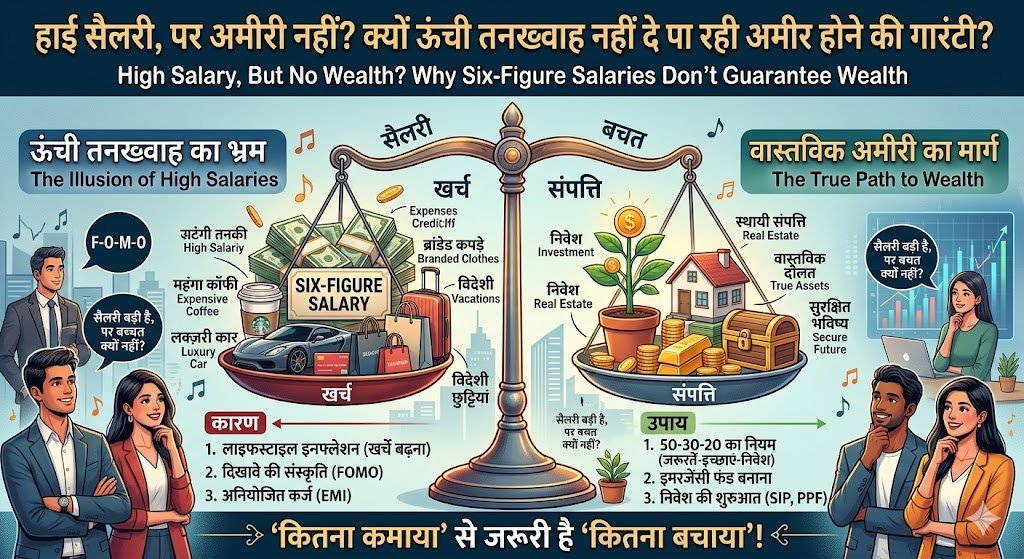 आधुनिक वर्क कल्चर में ‘सिक्स-फिगर सैलरी’ (महीने की लाखों में कमाई) एक स्टेटस सिंबल बन गई है। लेकिन वित्तीय विशेषज्ञों का कहना है कि “High salaries don’t guarantee wealth” (ऊंची सैलरी दौलत की गारंटी नहीं है)। ‘हाई सैलरी’ का भ्रम: शहरों में लाखों कमाने वाले प्रोफेशनल्स क्यों जूझ रहे हैं पैसों की तंगी से? शहरों में रहने वाले कई प्रोफेशनल्स आज ‘पे-चेक टू पे-चेक’ (सैलरी आते ही खत्म होना) वाली जिंदगी जी रहे हैं। अक्सर कहा जाता है कि जितनी बड़ी सैलरी, उतनी ही सुखद जिंदगी। लेकिन हालिया ट्रेंड्स और विशेषज्ञों की राय कुछ और ही कहानी बयां कर रही है। शहरी भारत में लाखों का पैकेज पाने वाले युवा प्रोफेशनल्स महीने के अंत तक बचत के लिए संघर्ष कर रहे हैं। आखिर कहाँ जा रहा है यह सारा पैसा?